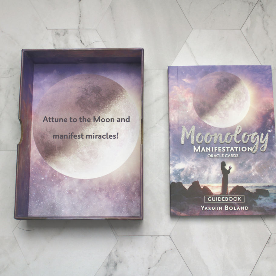 The Moonology Manifestation Oracle card deck by Yasmin Boland includes a 48-card deck and 144 page guidebook. This deck allows the user to easily manifest their dreams using the power of the moon. Beautifully presented and illustrated by Lori Menna.